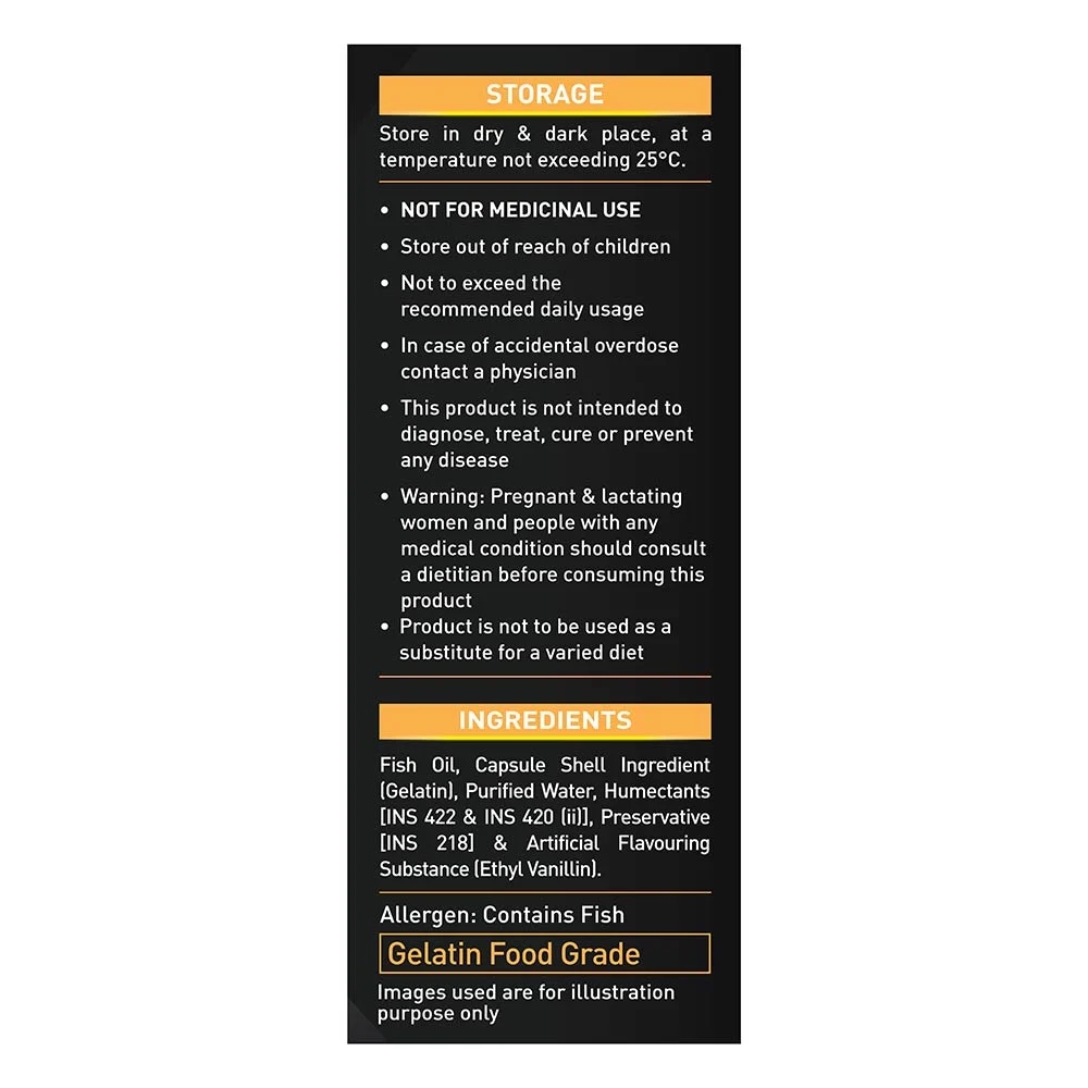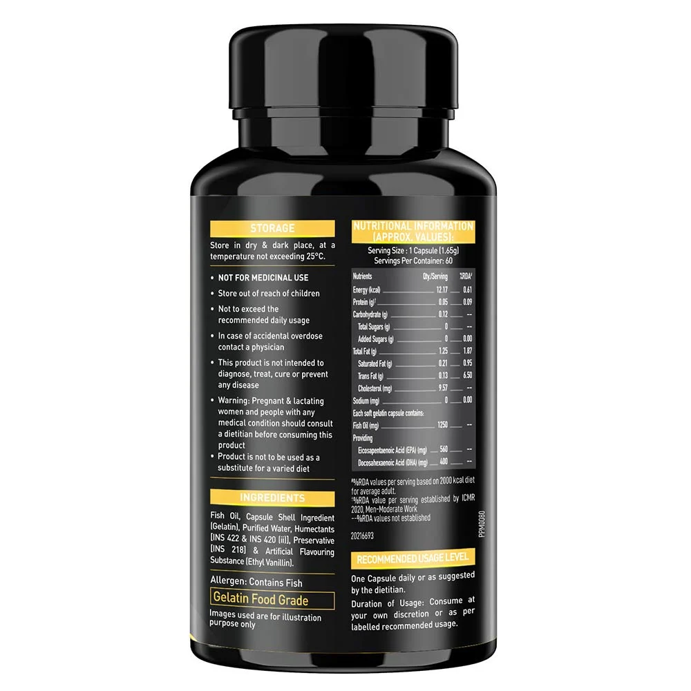 - 1 MuscleBlaze Fish Oil Gold each softgel containing 1250mg of omega-3 fatty acids that provides 560mg EPA (Eicosapentaenoic acid) and 400mg DHA (docosahexaenoic acid)