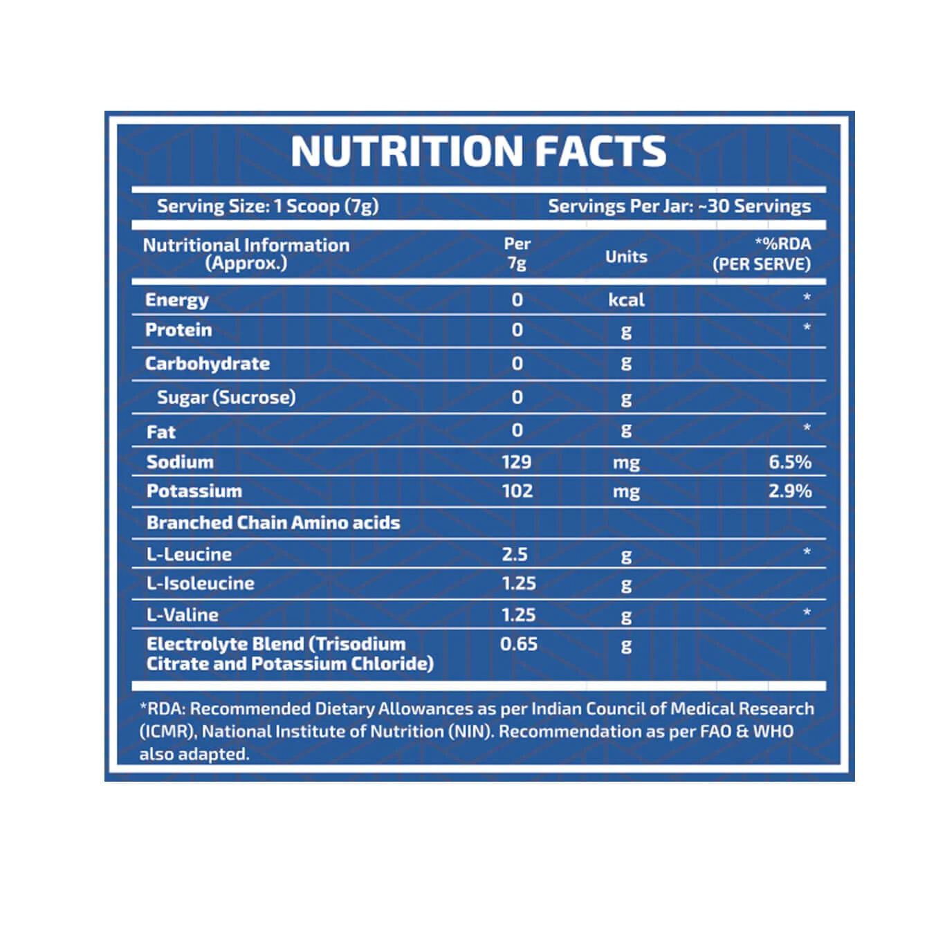 - A blend of three essential amino acids: Leucine (2.5g), Isoleucine (1.25g) and Valine (1.25g) in the ratio of 2:1:1